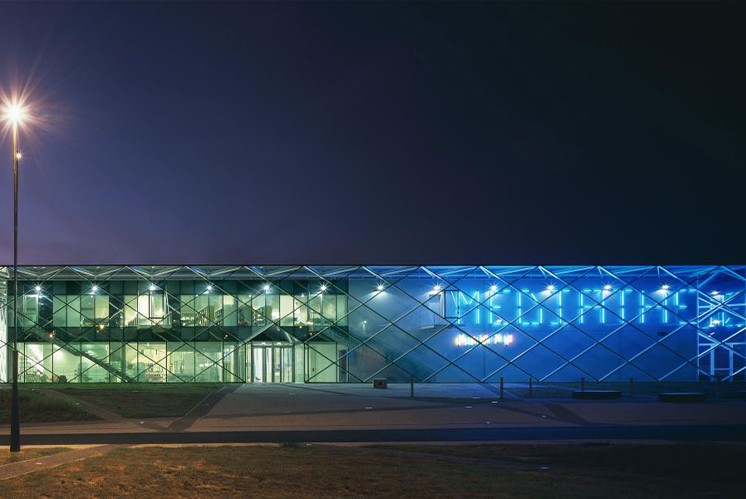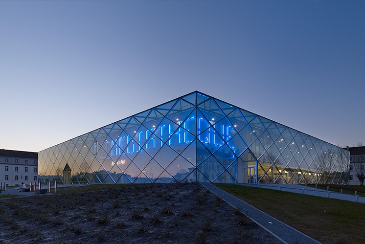 Jér?me Mignot在設(shè)計中巧妙地利用了發(fā)光字和藍色燈光,設(shè)計元素夜間尤為醒目,為圖書館的外觀增添了一抹未來感與科學(xué)氛圍感。線段式信息設(shè)計,靈感直接來源于建筑的外觀,通過強調(diào)線條的結(jié)構(gòu)美,使得內(nèi)部信息的呈現(xiàn)既清晰又具有藝術(shù)感。此外,地庫的黑白配色設(shè)計,簡約而不失格調(diào),為整個空間營造了一致性和整體性。