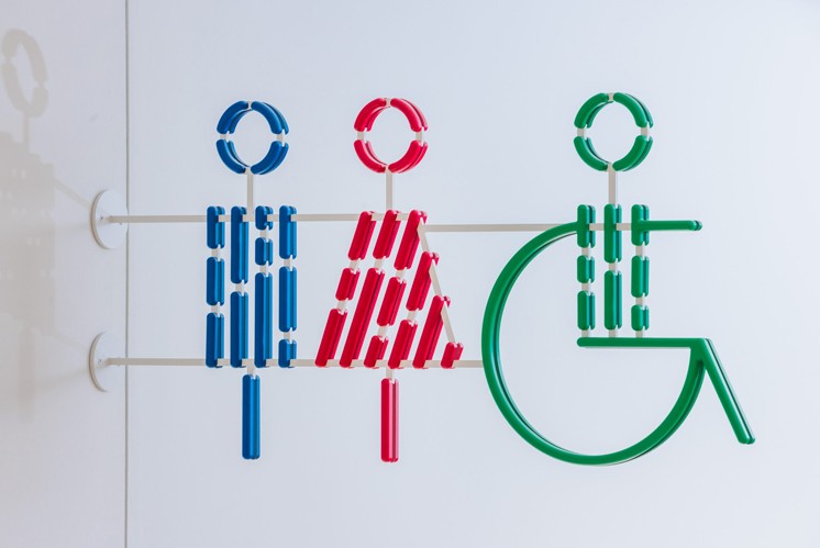 以衛(wèi)生間標(biāo)識(shí)為例,其形態(tài)采用模塊化的線條組合,塑造出男性、女性與殘障人士的形象,造型簡(jiǎn)潔現(xiàn)代卻充滿巧思。鮮明的色彩對(duì)比與規(guī)整的線條排列,既確保了功能識(shí)別的清晰性 —— 使用者能瞬間分辨不同區(qū)域,又因造型的活潑感傳遞出友好氛圍,讓導(dǎo)視不再只是冰冷的指示工具,更成為體現(xiàn)場(chǎng)所關(guān)懷的視覺(jué)符號(hào),提升了使用者與標(biāo)識(shí)互動(dòng)時(shí)的舒適觀感。