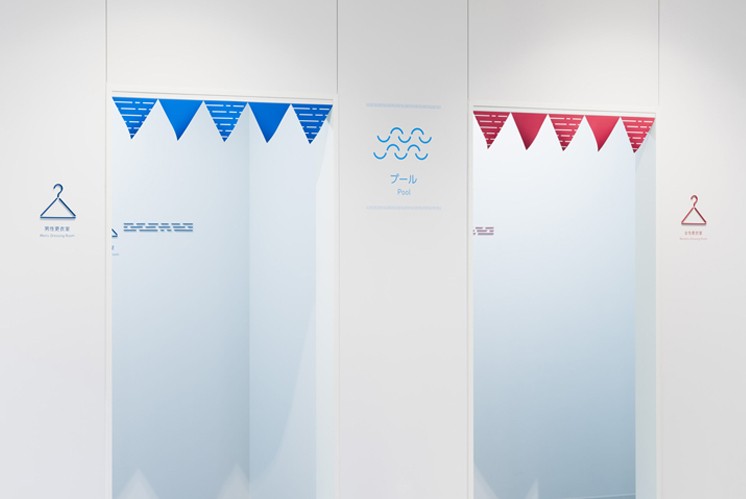 導(dǎo)視系統(tǒng)以象征水體清涼感的藍(lán)色為主色調(diào),精準(zhǔn)呼應(yīng)厚木市親切廣場(chǎng)依傍相模川等河流、水景豐沛的自然稟賦。藍(lán)色并非單調(diào)呈現(xiàn),在不同功能標(biāo)識(shí)里,它或作為主色營(yíng)造靜謐舒爽的氛圍,如摩托車(chē)停車(chē)場(chǎng)與工作室標(biāo)識(shí)中的藍(lán)色,貼合健康養(yǎng)生設(shè)施的調(diào)性;同時(shí)搭配紅色、綠色等輔助色,像衛(wèi)生間標(biāo)識(shí)里的紅、綠元素,既清晰劃分不同性別與特殊需求的功能區(qū)域,又與藍(lán)色主調(diào)形成和諧的色彩層次,整體為空間鋪陳出清爽且富有親和力的視覺(jué)基底。