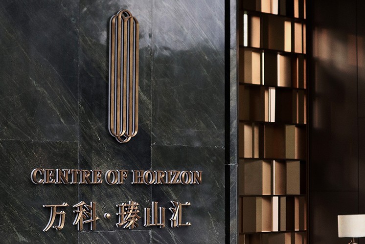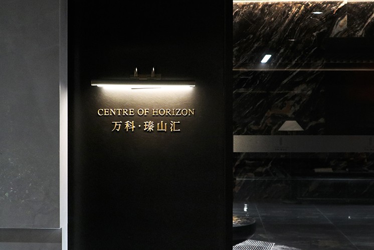 主入口處項(xiàng)目標(biāo)識(shí)“萬科?瑧山匯” 的立體字嵌入深色大理石墻面,暖調(diào)金屬光澤與冷冽石材形成強(qiáng)烈對(duì)比,光線照射下折射出豐富光影,恰似黃旗山景的沉穩(wěn)與住宅奢華感的碰撞。