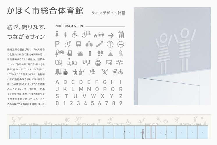 該綜合體育館標(biāo)識(shí)系統(tǒng)設(shè)計(jì),作為 2024 年日本 SDA 設(shè)計(jì)獎(jiǎng)入選作品,以城市紡織工業(yè)歷史與建筑 “培育?編織” 的理念為核心靈感,打造出兼具功能與文化內(nèi)涵的視覺符號(hào)系統(tǒng)。該市橡膠混紡織物產(chǎn)業(yè)的獨(dú)特背景,與體育館 “聯(lián)結(jié)市民、自然與文化” 的訴求相碰撞,催生出這套既具地域辨識(shí)度又富人文溫度的標(biāo)識(shí)體系。