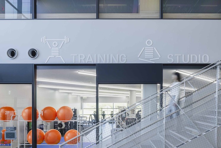 從觀感體驗(yàn)而言,標(biāo)識(shí)系統(tǒng)在空間中的呈現(xiàn)營造出連貫且富有層次的視覺敘事。主通道挑空區(qū)域的壁畫式動(dòng)態(tài)呈現(xiàn),讓源自紡紗與織造的象形符號(hào)仿佛擁有流動(dòng)的生命,為空間注入動(dòng)態(tài)活力;而訓(xùn)練室、柔劍道場(chǎng)、studio 等不同功能區(qū)的標(biāo)識(shí),既遵循整體設(shè)計(jì)語言保持統(tǒng)一感,又通過符號(hào)形態(tài)的細(xì)微變化區(qū)分場(chǎng)景,使市民在使用場(chǎng)館時(shí),既能感受到視覺引導(dǎo)的清晰性,又能體會(huì)到文化浸潤的細(xì)膩感,增強(qiáng)了空間與使用者之間的情感聯(lián)結(jié)。